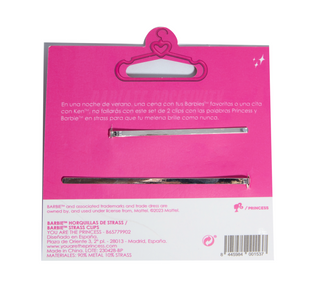 En una noche de verano, una cena con tus Barbies™ favoritas o una cita con Ken, no fallarás con este set de 2 clips con las palabras Princess y Barbie en strass para que tu melena brille como nunca.