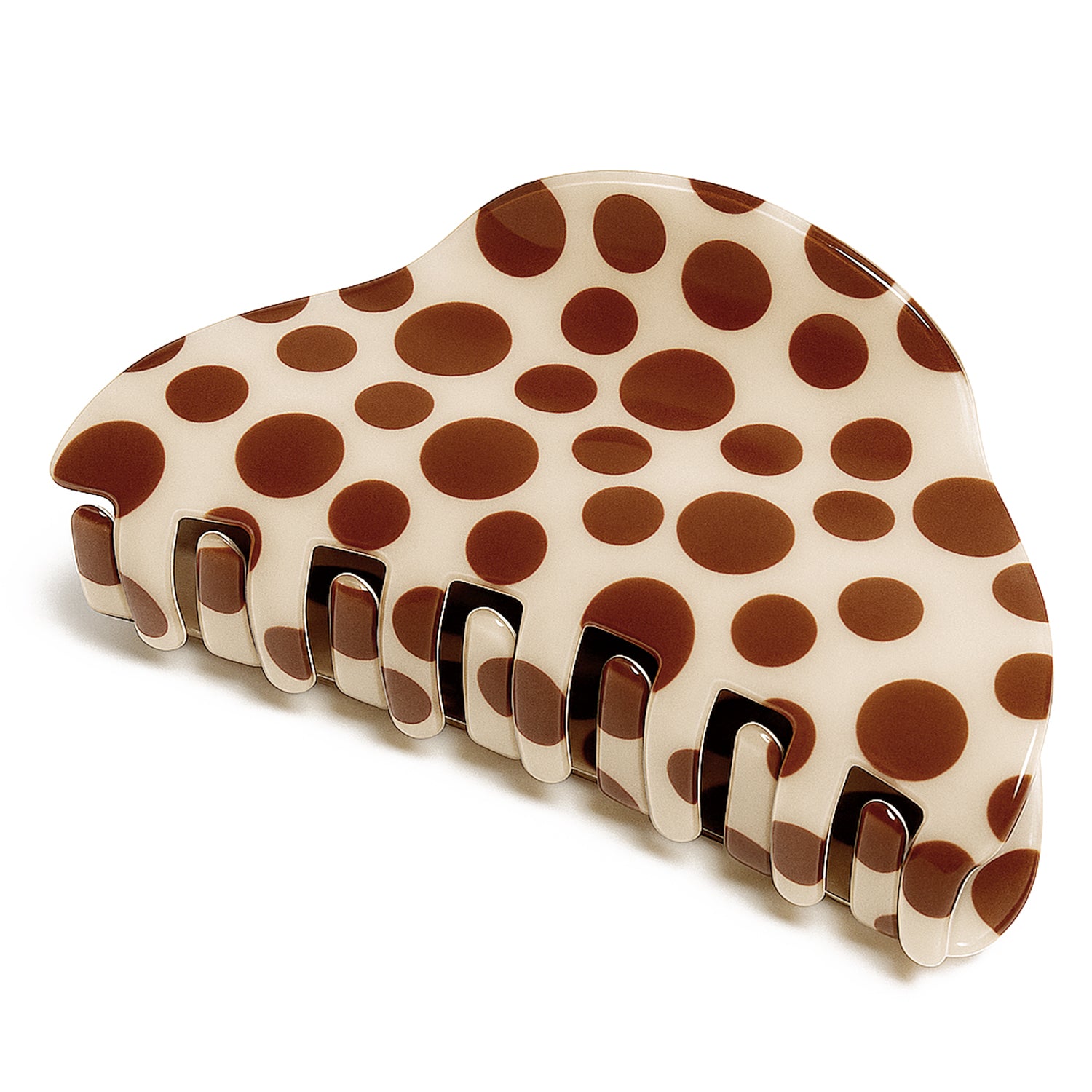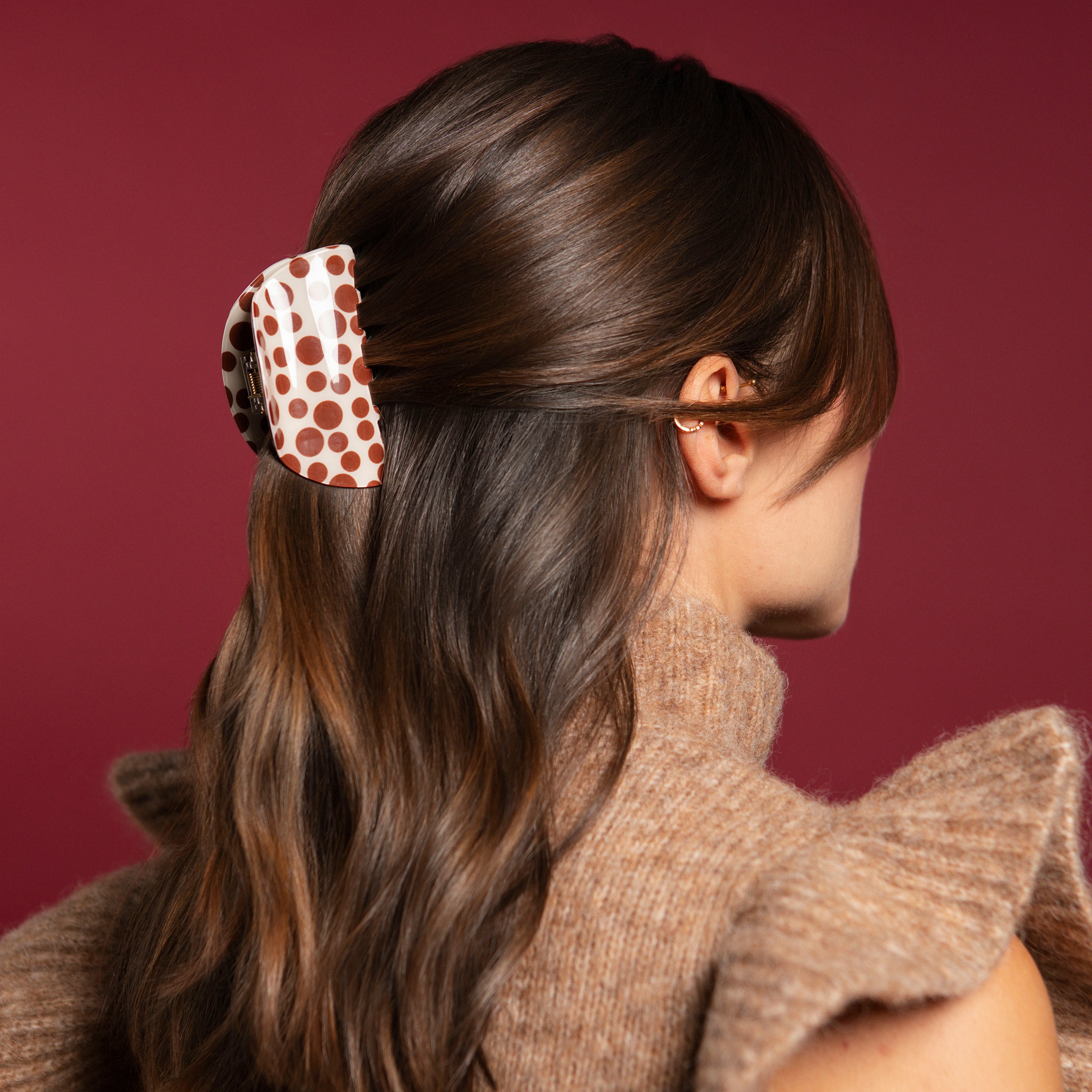 Pinza ovalada de lunares disponible en dos modelos diferentes. Ideal para recoger tu melena y darle un toque especial a tus peinados.