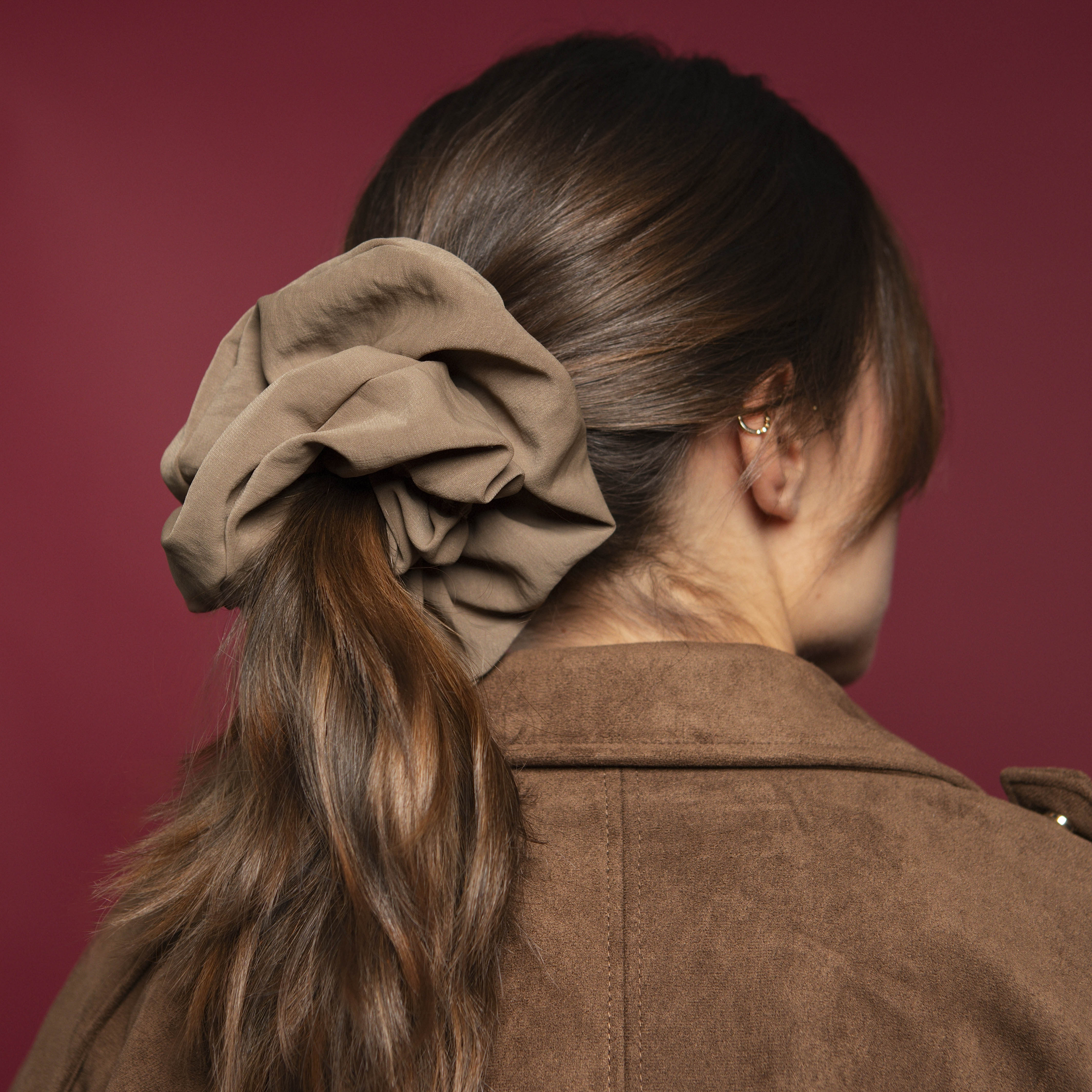 Scrunchie suave en tonos tierra disponible en dos modelos. Puedes usarlo para coletas, moños y semi-recogidos. Perfecto para darle un toque divertido a tus peinados.