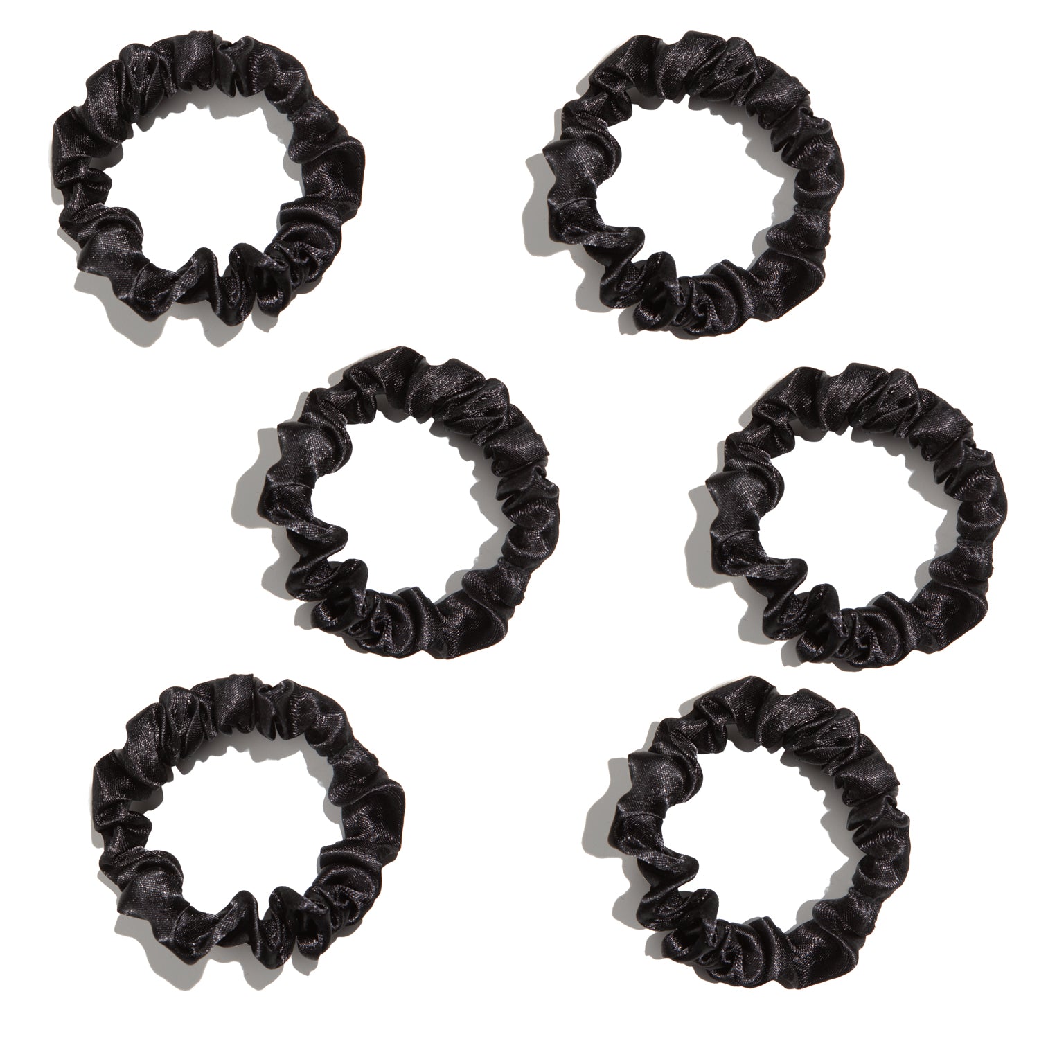 Set de 6 mini scrunchies de raso. Perfectos para recoger tu melena y darle un toque especial a todos tus peinados. No parten ni dañan el pelo debido al material suave del que están hechos.