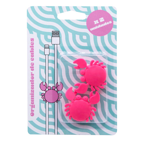 Organizador de cables fabricado en silicona y con forma de cangrejo. Siempre tendrás todos tus cables protegidos y organizados. Contiene dos piezas elaboradas en silicona y adhesivo en la parte trasera.