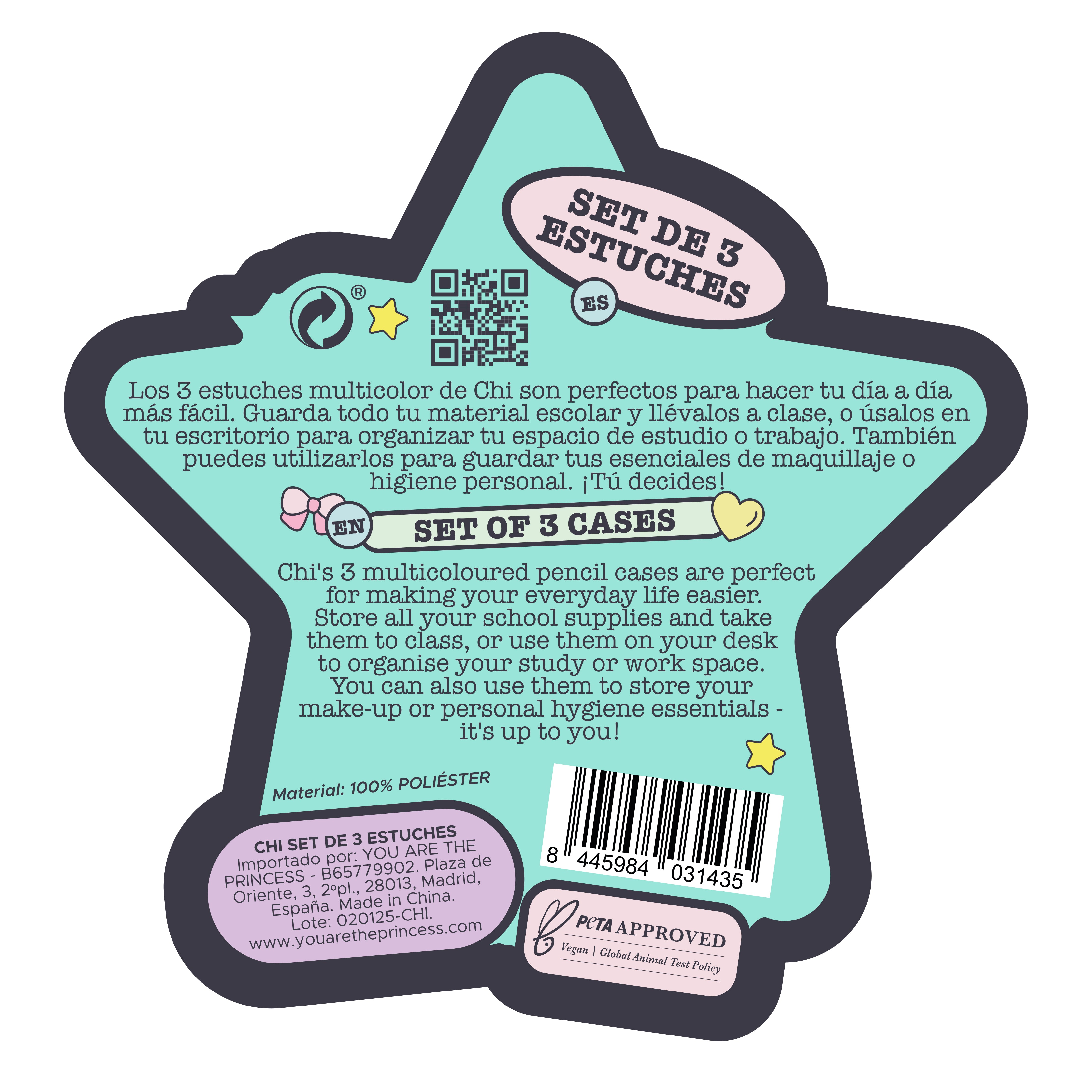Los 3 estuches multicolor de Chi son perfectos para hacer tu día a día más fácil. Guarda todo tu material escolar y llévalos a clase, o úsalos en tu escritorio para organizar tu espacio de estudio o trabajo. También puedes utilizarlos para guardar tus esenciales de maquillaje o higuiene personal. ¡Tú decides!