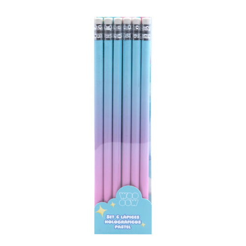 ¡Haz que tu material escolar brille con estilo! El Set de 6 Lápices Holográficos de WOO OOW es perfecto para dar un toque divertido y original a tus notas y dibujos. Cada lápiz incluye goma de borrar en la parte superior para mayor practicidad.