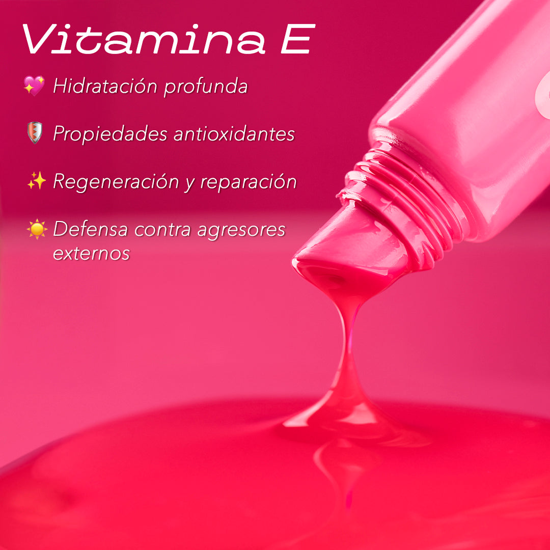 La vitamina E aporta hidratación, protección antioxidante y ayuda a reparar labios agrietados, defendiendo contra agresores externos. El aceite de oliva, rico en ácidos grasos y polifenoles, nutre en profundidad, regenera y deja un brillo natural con una textura sedosa. Por su parte, el aceite de ricino intensifica el brillo, retiene la humedad y prolonga la duración del gloss, proporcionando un acabado jugoso y confortable.