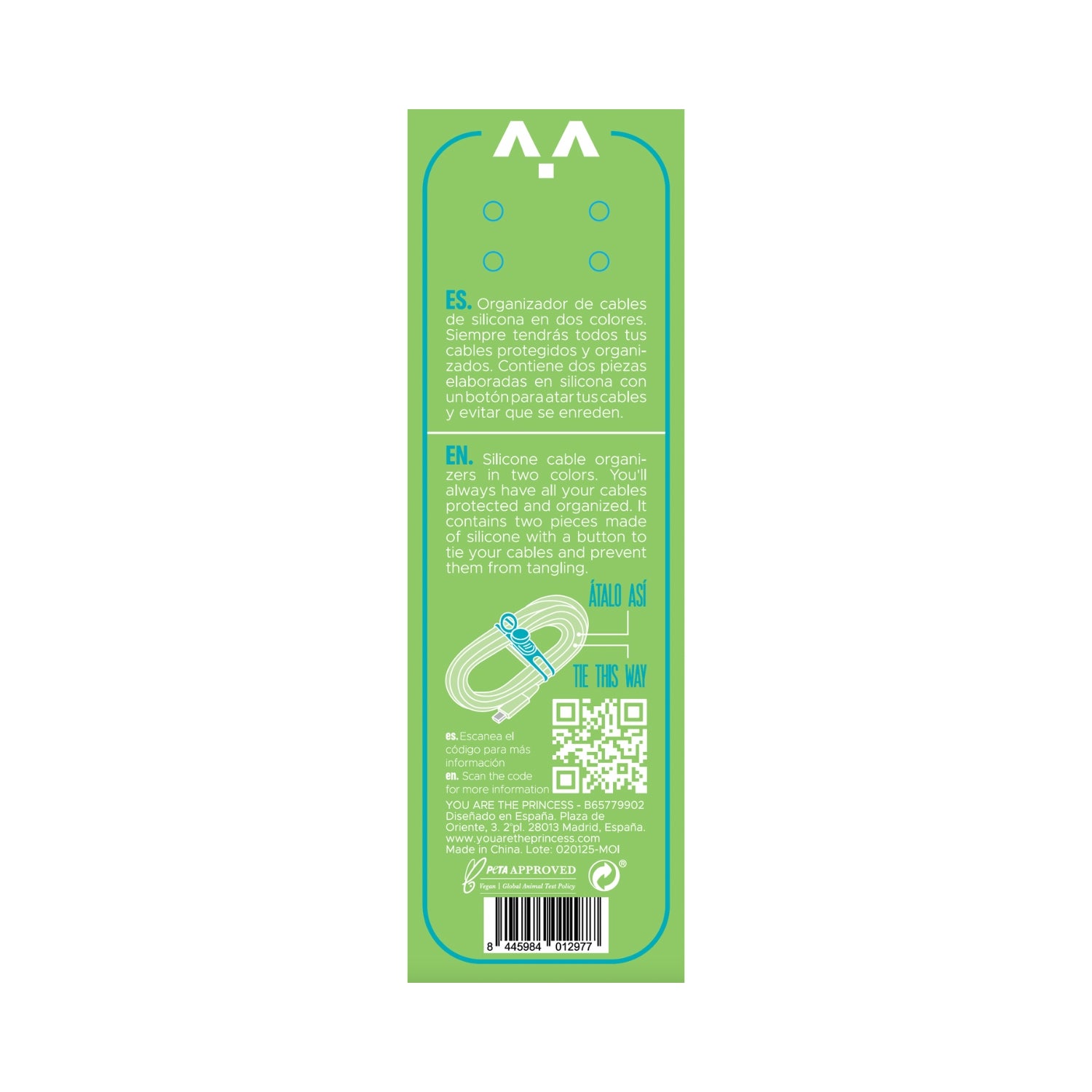 Organizador de cables de silicona en dos colores. Siempre tendrás todos tus cables protegidos y organizados. Contiene dos piezas elaboradas en silicona con un botón para atar tus cables y evitar que se enreden.