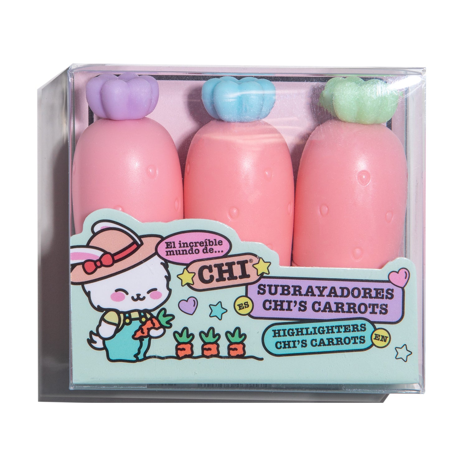 El Set de 3 Subrayadores Chi's Carrots em forma de zanahoria, son ideales para añadir a tu estuche o para tenerlos en tu escritorio. Podrás destacar las ideas importantes, crear títulos increíbles o incluso colorear con ellos. ¡SUPER CUTE, SUPER CHI!