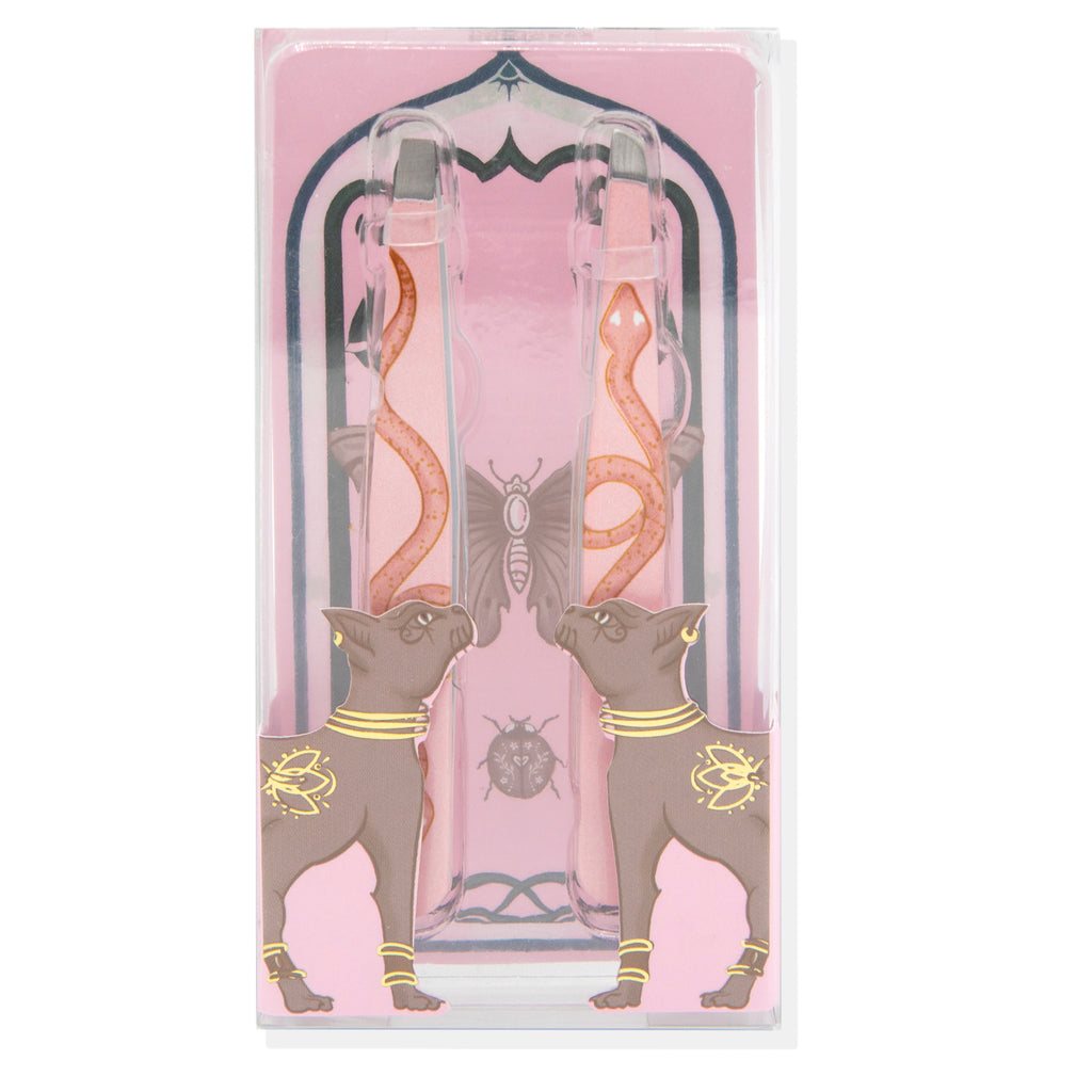 Set de 2 pinzas de depilar rosas de acero inoxidable con estampado de serpiente. Incluye una pinza de punta biselada y una pinza de punta recta. Ambas de precisión y perfectas para eliminar todo tipo de vello.