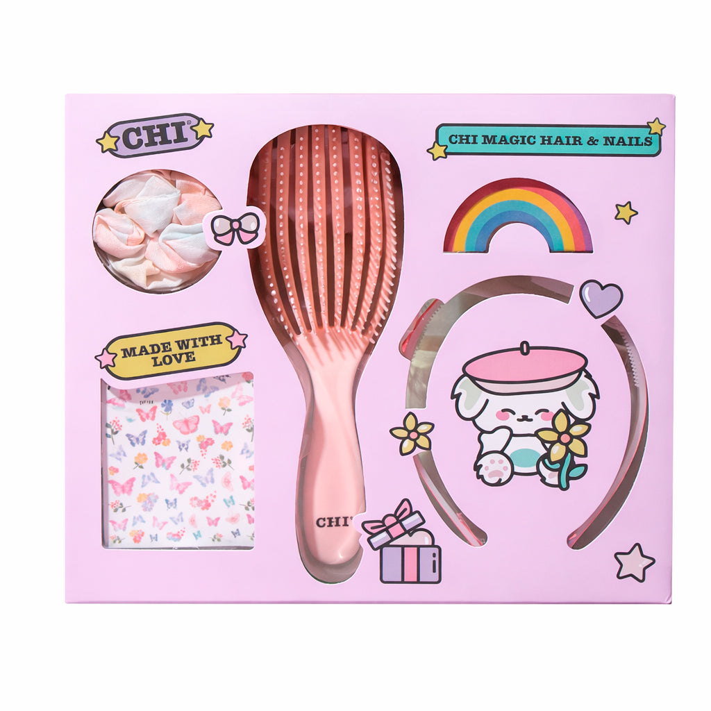 Llena tu rutina de alegría y diversión con CHI Magic Hair & Nails. Un kit adorable con accesorios y básicos beauty pensados para peques creativas: peina, decora, pule, brilla y juega con el estilo más cute de CHI.