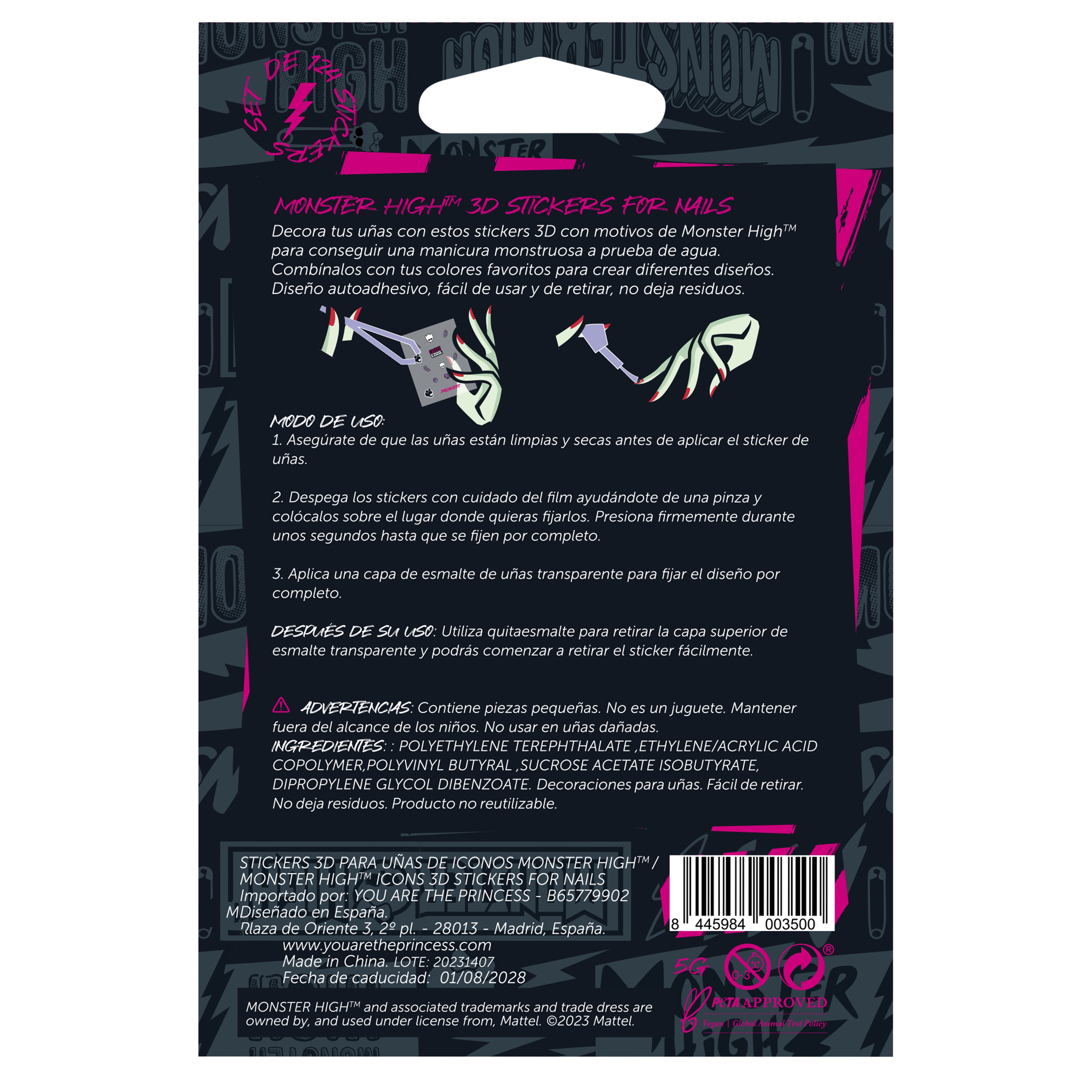 Decora tus uñas con estos stickers 3D con motivos de Monster High™ para conseguir una manicura monstruosa a prueba de agua. Combínalos con tus colores favoritos para crear diferentes diseños. Diseño autoadhesivo, fácil de usar y de retirar, no deja residuos.