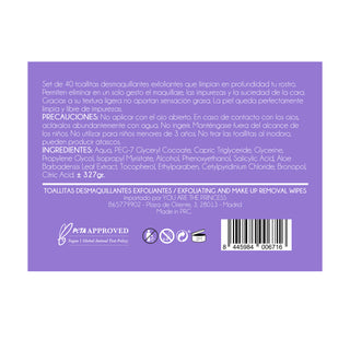 Set de 40 toallitas desmaquillantes exfoliantes que limpian en profundidad tu rostro. Permiten eliminar en un solo gesto el maquillaje, las impurezas y la suciedad de la cara.